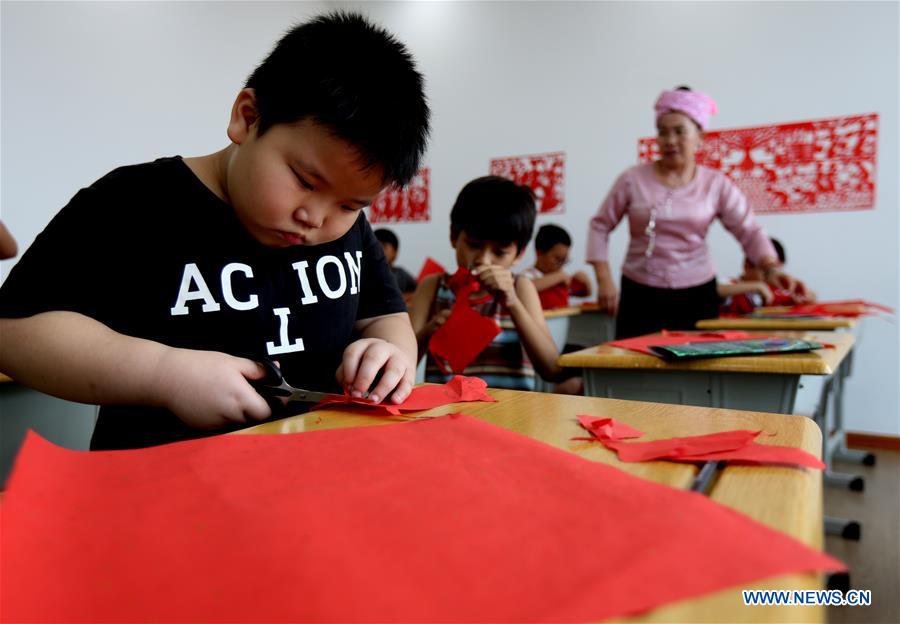 A child makes Chinese paper-cutting works during the China-Myanmar Cultural Week in Yangon, Myanmar, Jan. 19, 2019. The China-Myanmar Cultural Week was launched on Wednesday in Yangon, Nay Pyi Taw and Mandalay and will last until Sunday. (Xinhua/U Aung)