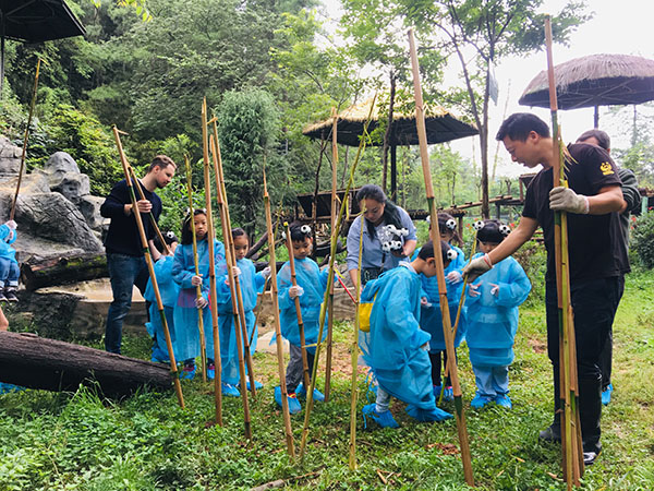 Staff of the park and the 15 kids put on panda headgear and clothes, and enter the living area of the pandas. Their jobs are cleaning the venues, preparing bamboos and making a birthday cake. To increase the amount of exercise of pandas, the park has designed a simulated place in which bamboos are inserted into the soil to look like they grows in the forest.