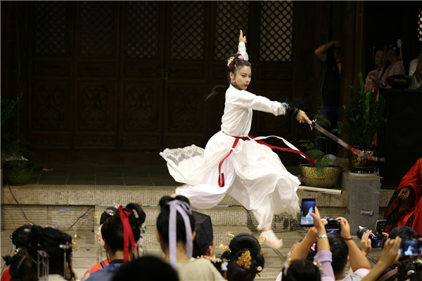 In No.88 Theater, the elegant traditional Chinese music brought audience a feeling of being in the past time. Guzheng (a 21-or 25-stringed plucked instrument), Pipa (lute), sleeve shaking dance, sword dance and other Chinese performance were given by beautiful girls in traditional clothes. Charles, a Nepali man, took a lot of photos to record the moments while his German friend Michael praised the wonderful dance.