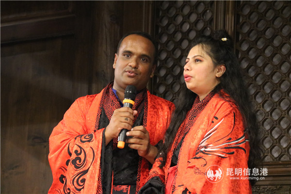 Kabir Md Alamgir and his wife Begum Ayesha are from Bangladesh. They dressed in Han Chinese clothing and sang Onek Sadhonar Pora Ami, a Bangladeshi love song. They introduced their life in Yunnan in fluent Chinese.