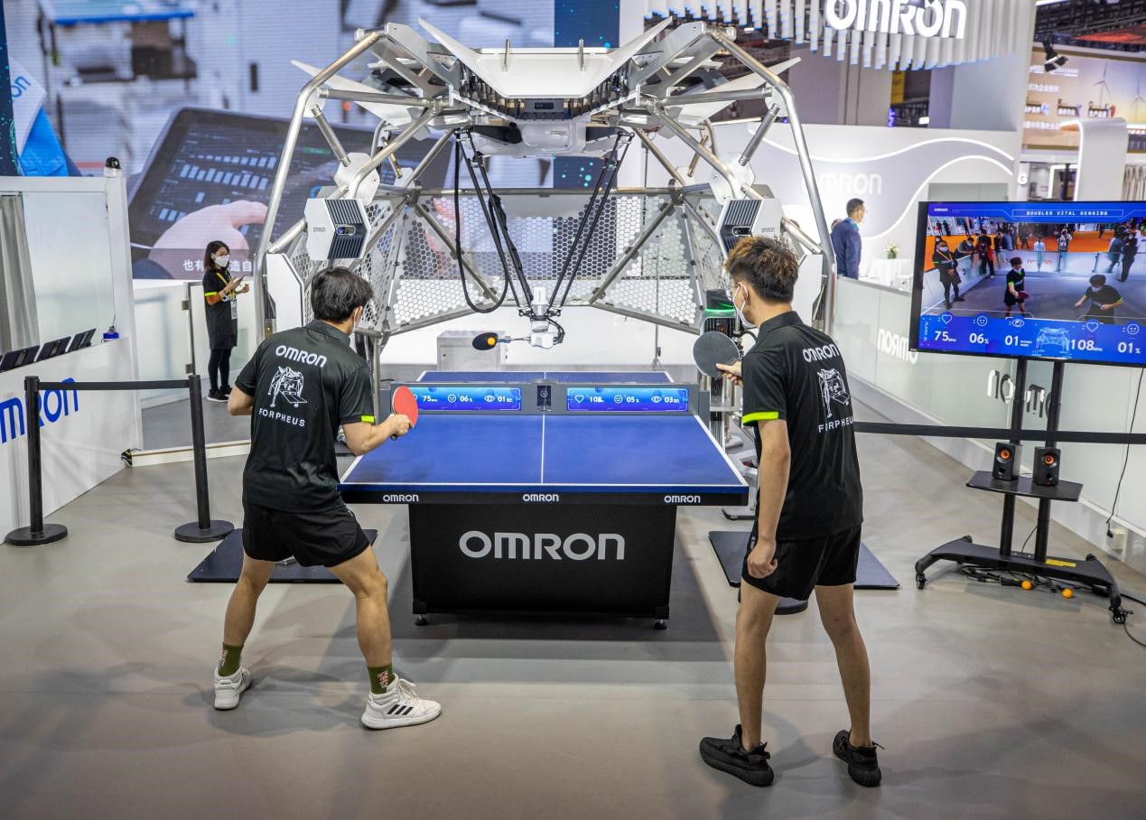 Staff members demonstrate playing table tennis with an Omron robot at the fifth China International Import Expo, which opened on Nov. 5, 2022 in Shanghai. (People's Daily/Zhang Wujun)