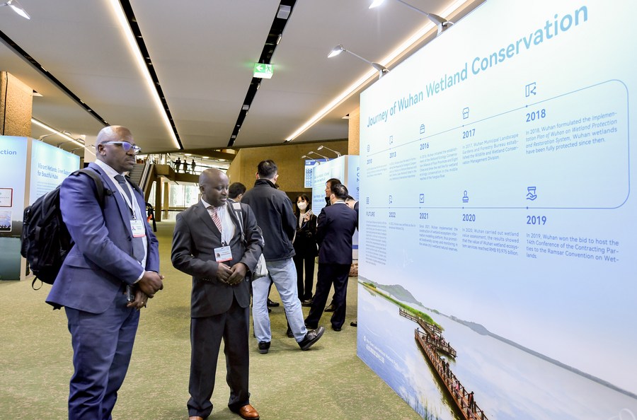 Participants view the exhibition on China's progress in wetland protection and restoration at the 14th Meeting of the Conference of the Contracting Parties to the Ramsar Convention on Wetlands (COP14) in Geneva, Switzerland, Nov. 5, 2022. (Xinhua/Lian Yi)