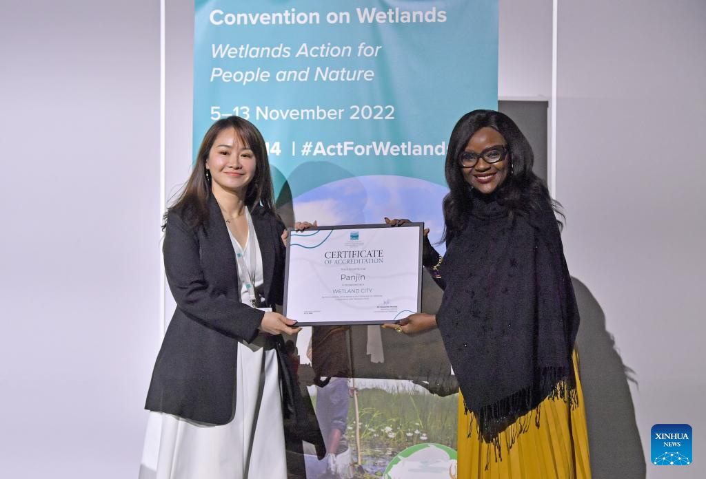 Musonda Mumba (R), secretary-general of the Ramsar Convention, gives the certificate of accreditation that recognises Panjin of northeast China's Liaoning Province as the international wetland city to a Chinese representative during the 14th Meeting of the Conference of the Contracting Parties (COP14) to the Ramsar Convention on Wetlands, in Geneva, Switzerland, Nov. 10, 2022. Twenty-five cities from 13 countries, notably seven from China, were accredited on Thursday by the Ramsar Convention as international wetland cities. (Xinhua/Lian Yi)