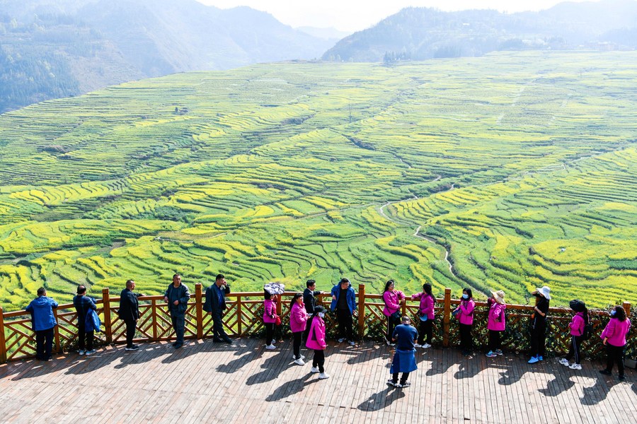 Tourists view the scenery of cole flower fields in Panzhou, southwest China's Guizhou Province, March 7, 2022. (Xinhua/Yang Wenbin)