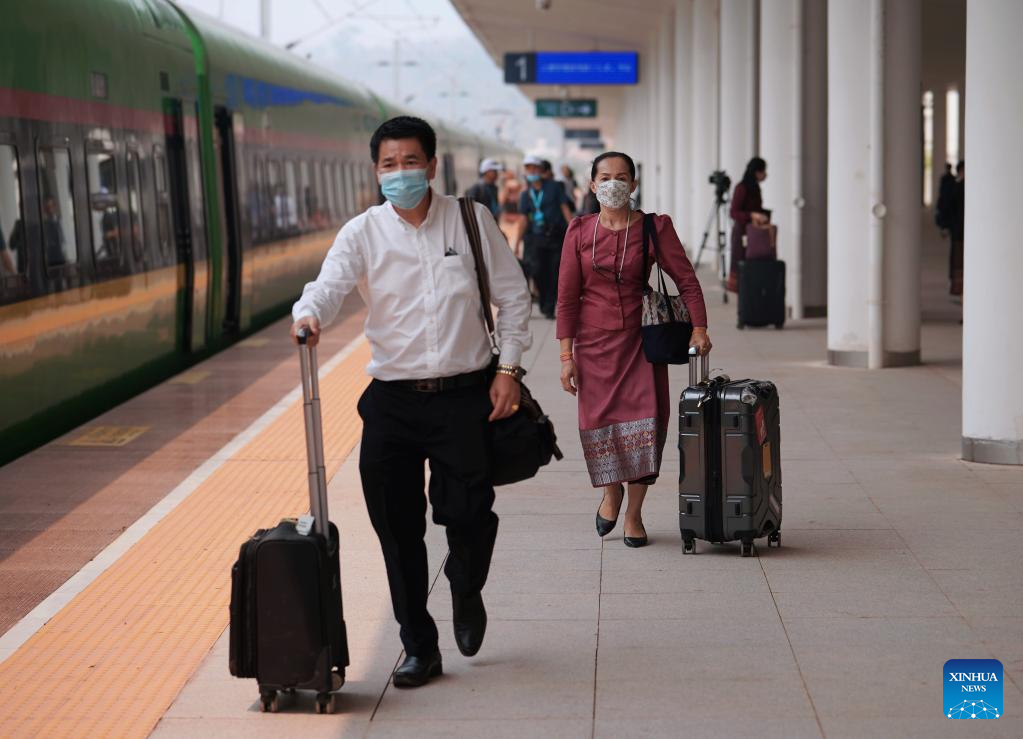 Passengers prepare to board the first cross-border passenger train from Kunming in southwest China's Yunnan Province to Lao capital Vientiane at the Boten Station of the China-laos Railway in Luang Namtha, Laos on April 13, 2023. The China-Laos Railway started cross-border passenger services on Thursday, a move that is expected to boost regional connectivity. (Xinhua/Xing Guangli)