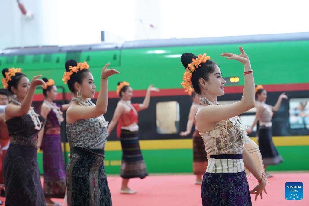 Performers dance during a launch ceremony for the first passenger train from Kunming to the Lao capital Vientiane at Kunming South Railway Station in Kunming, southwest China's Yunnan Province, April 13, 2023. (Xinhua/Wang Changshan)