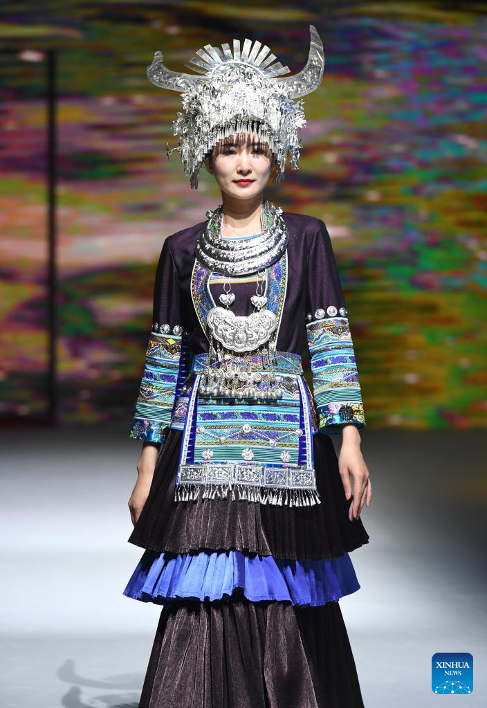 A model presents an ethnic costume during a costume show in Nanning, south China's Guangxi Zhuang Autonomous Region, April 24, 2023. (Xinhua/Zhou Hua)