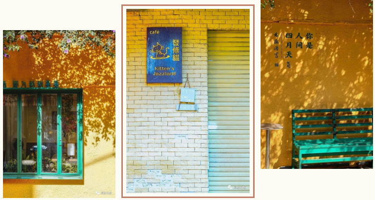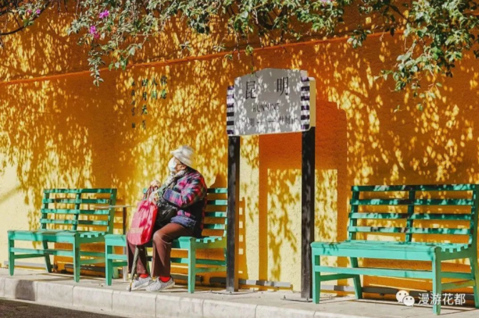 Strolling on the street, a beautiful yellow wall comes into view. The bougainvilleas hang on the green bench, and the sunlight shines through the leaves, reflecting on the yellow wall. When leaning on the wall, it feels like returning to the old Kunming full of memories.