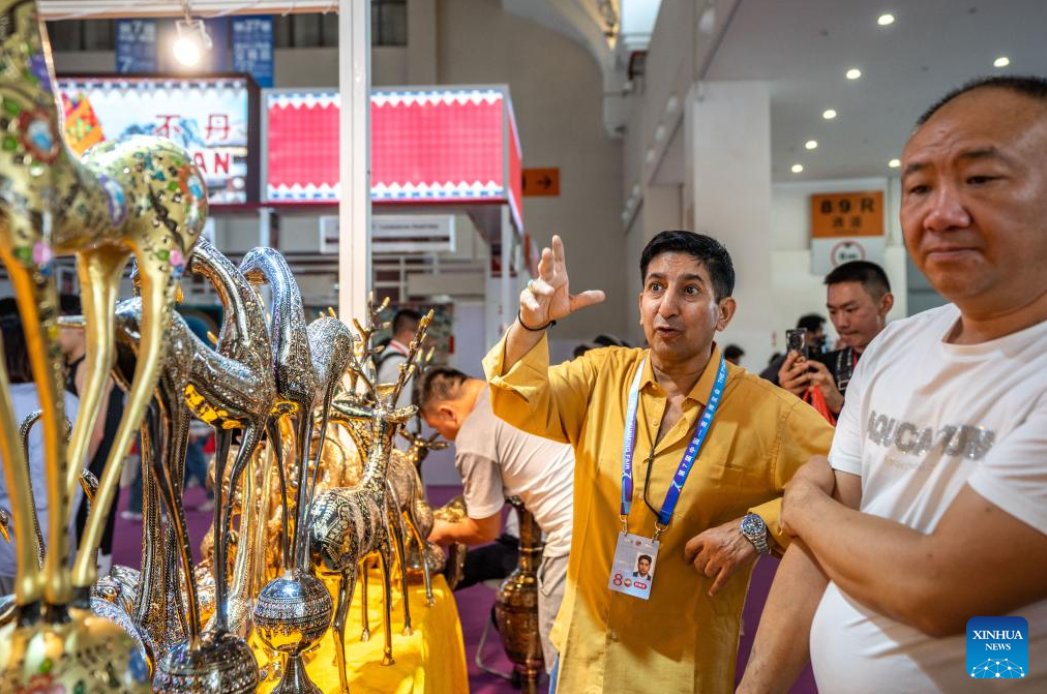 An exhibitor introduces products from India at the seventh China-South Asia Expo in Kunming, southwest China's Yunnan Province, Aug. 16, 2023. The seventh China-South Asia Expo kicked off Wednesday in Kunming.