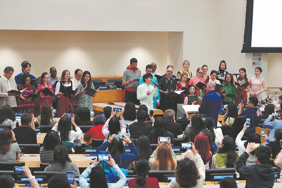 Zhou performing at the Chinese Language Day event at the United Nations headquarters in New York on April 18. MINLU ZHANG/CHINA DAILY