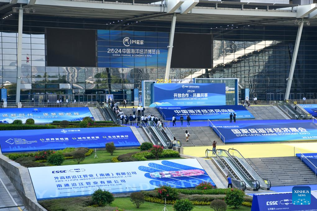 This photo taken on Oct. 31, 2024 shows the venue for the 2024 China Marine Economy Expo (CMEE) in Shenzhen, south China's Guangdong Province. The 2024 CMEE kicked off in Shenzhen on Thursday, comprehensively showcasing China's marine economic development, and scientific and technological innovation. (Xinhua/Liang Xu)