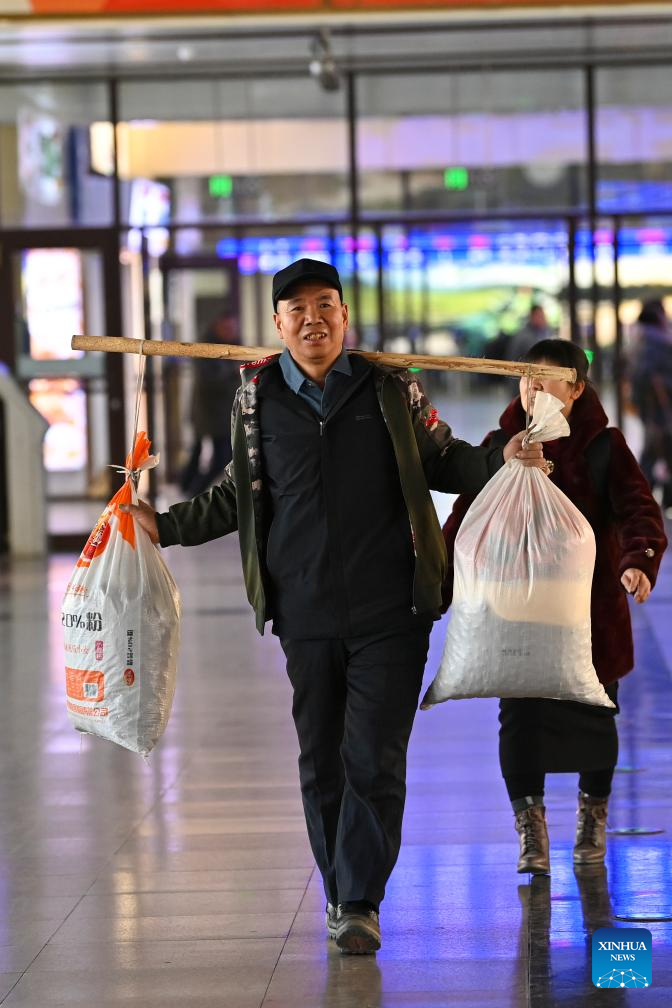 Travelers walk in Beijing West Railway Station in Beijing, capital of China, Jan. 14, 2025. The Spring Festival, China's biggest traditional holiday, will fall on Jan. 29 this year. The Spring Festival travel rush, or chunyun, the world's largest annual human migration known for its high transportation demand as millions return home for family reunions, kicked off on Tuesday. (Xinhua/Du Zixuan)
