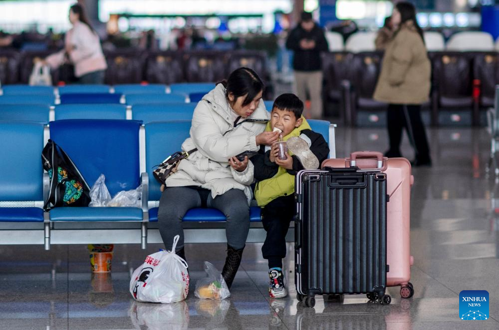 A mother and her son have breakfast at Kunming South Railway Station in Kunming, southwest China's Yunnan Province, Jan. 14, 2025. The Spring Festival, China's biggest traditional holiday, will fall on Jan. 29 this year. The Spring Festival travel rush, or chunyun, the world's largest annual human migration known for its high transportation demand as millions return home for family reunions, kicked off on Tuesday. (Xinhua/Jiang Wenyao)