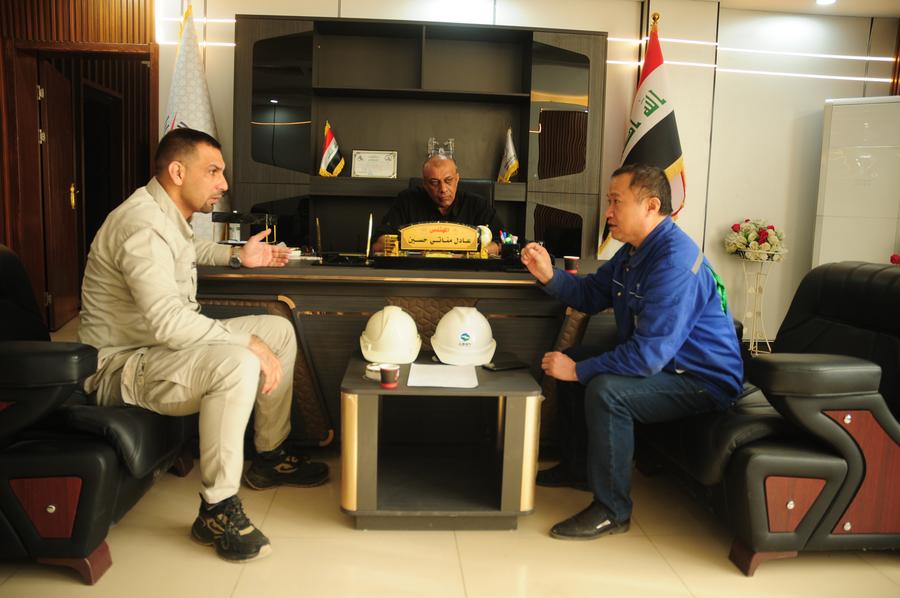 Staff members from China and Iraq negotiate the progress of the overhaul project at the Wasit Power Plant, in Wasit Province, Iraq, Feb. 11, 2025. (Xinhua/Duan Minfu)