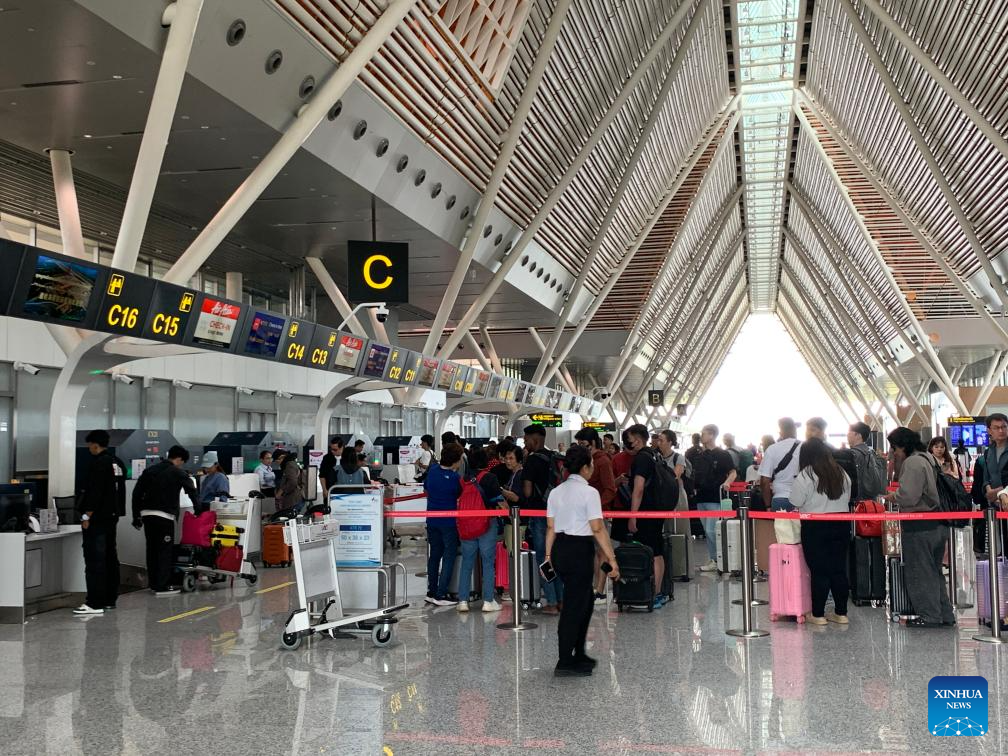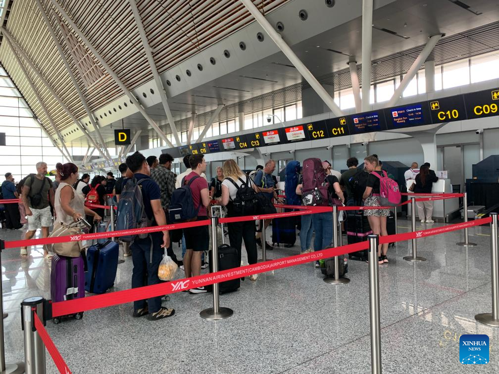 Passengers queue to check in at the Siem Reap Angkor International Airport in Siem Reap province, Cambodia on Oct. 16, 2025. The Chinese-invested Siem Reap Angkor International Airport (SAI) on Thursday marked the second anniversary of its operations. (Photo by Van Pov/Xinhua)