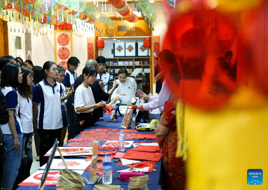 Students learn Chinese traditional paper-cutting during a traditional Chinese paper-cutting exhibition at the China Cultural Center in Yangon, Myanmar, Nov. 5, 2025. A traditional Chinese paper-cutting exhibition was held at the China Cultural Center in Yangon on Wednesday. (Xinhua/Myo Kyaw Soe)