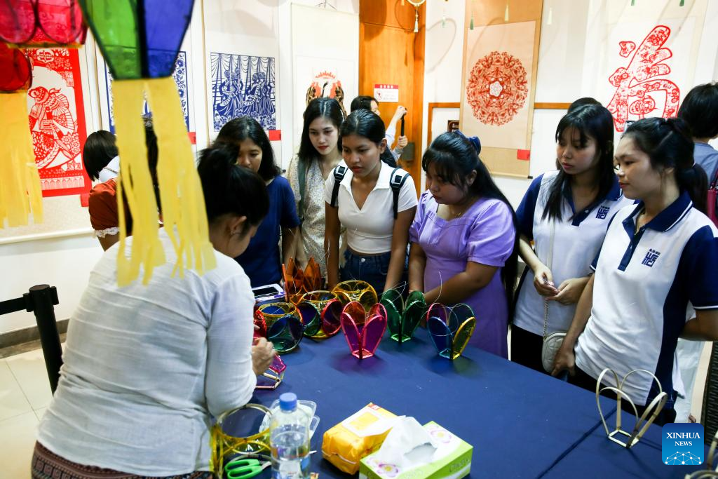 People attend a traditional Chinese paper-cutting exhibition at the China Cultural Center in Yangon, Myanmar, Nov. 5, 2025. A traditional Chinese paper-cutting exhibition was held at the China Cultural Center in Yangon on Wednesday. (Xinhua/Myo Kyaw Soe)