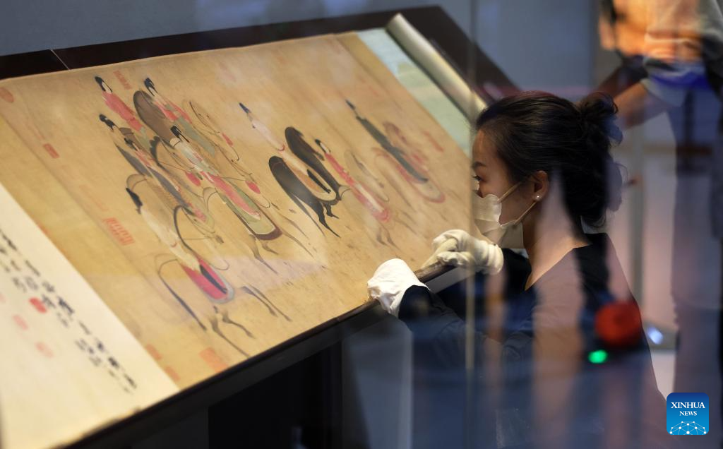 Staff members prepare a Song Dynasty (960-1279 AD) replica of the painting "Lady Guoguo's Spring Outing" for exhibition at Liaoning Provincial Museum in Shenyang, northeast China's Liaoning Province, Dec. 29, 2025. The painting, attributed to Tang Dynasty (618-907 AD) court painter Zhang Xuan, is one of the figure painting masterpieces depicting aristocratic women. The work will be on display at Liaoning Provincial Museum from Dec. 30, 2025 to March 29, 2026. (Xinhua/Li Gang)