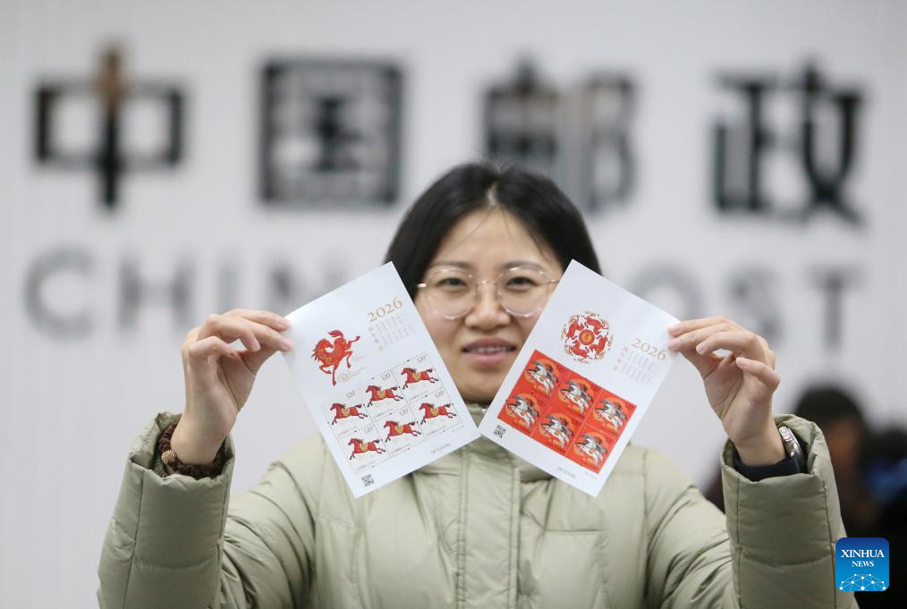 People buy special stamps marking the Year of the Horse in Lianyungang, east China's Jiangsu Province, Jan. 5, 2026. China Post on Monday unveiled a set of two special stamps to celebrate the upcoming Chinese zodiac Year of the Horse. (Photo by Geng Yuhe/Xinhua)