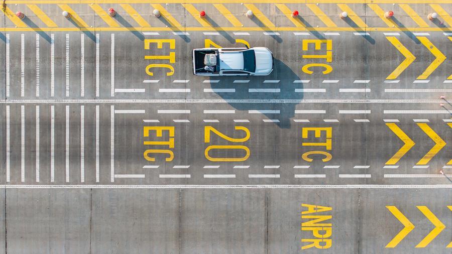 An aerial drone photo taken on March 17, 2025 shows a car arriving at the Phnom Penh toll station on the Phnom Penh-Sihanoukville Expressway in Cambodia. (Xinhua/Cheong Kam Ka)