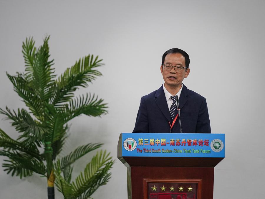 Liu Hongwu, director general of the Institute of African Studies of Zhejiang Normal University, addresses the third South Sudan-China Think Tank Forum in Juba, South Sudan, April 12, 2024. (Xinhua/Han Xu)