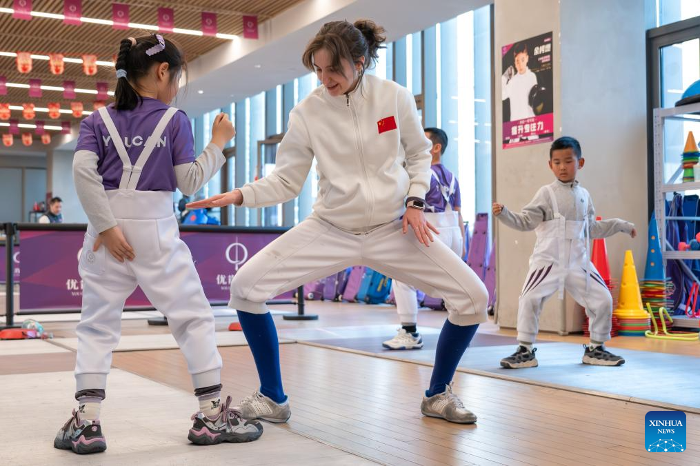Zaparivannaia Mariia from Russia instructs young students at a fencing club in Wuhan, central China's Hubei Province, Jan. 10, 2026. Zaparivannaia is a coach at a fencing club in Wuhan. (Xinhua/Du Zixuan)