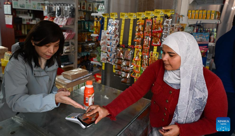 Fardous Muhammad Tawfik Abdelwanis (R) uses a mobile payment service at a grocery store in Haikou, south China's Hainan Province, Jan. 7, 2026. Fardous Muhammad Tawfik Abdelwanis from Egypt is currently a researcher at the Chinese Academy of Tropical Agricultural Sciences in south China's Hainan. (Xinhua/Yang Guanyu)