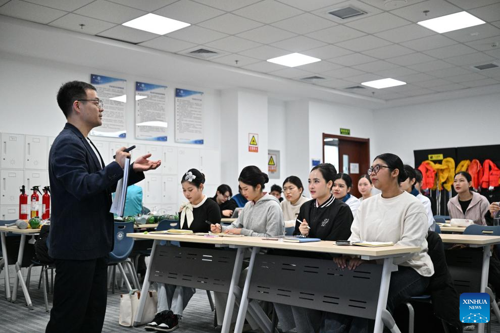 Students from Thailand's Suan Dusit University learn the psychology of cabin service during an exchange activity at the Civil Aviation University of China in Tianjin, north China, Jan. 8, 2026. (Xinhua/Sun Fanyue)