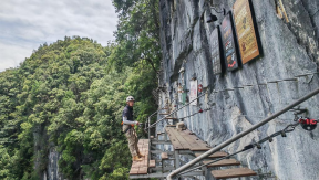 ?Suspended on a cliff face over 200 meters high, a café in the dense forests of Libo County, southwest China's Guizhou Province, serves premium coffee with a dash of vertigo, but only for those brave enough to make the climb.