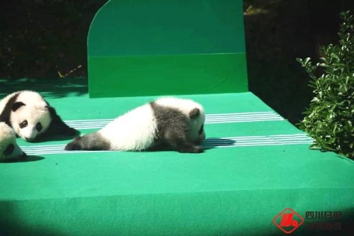 上午10 點(diǎn)30分左右,在成都熊貓基地太陽產(chǎn)房活動(dòng)場(chǎng),由7只新生大熊貓寶寶組成的“太陽天團(tuán)”依次被飼養(yǎng)員抱出場(chǎng)外,7只可愛的大熊貓寶寶有序的趴在畫有五線譜的地毯上,黑白相間的大熊貓寶寶好似一個(gè)個(gè)音符!