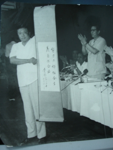 90年代,相聲表演大師馬三立(左一)與尹盛喜總經理(右二)、京韻大鼓表演藝術家駱玉笙(右一)、京劇表演藝術家李維康等在老舍茶館進行聯(lián)誼活動。
