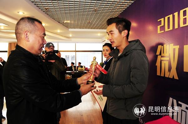 昆明市委宣傳部部務(wù)委員陳波為社會(huì)類一等獎(jiǎng)獲得者殷鑫頒獎(jiǎng)