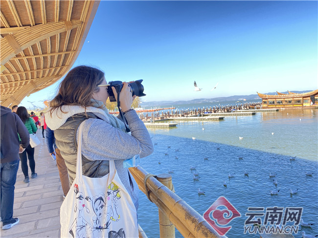 紅嘴鷗是昆明冬天的一道風景,這也是人與自然和諧相處的典范。在古滇藝海大碼頭,晴空暖陽下,記者們也與市民、游客一起觀鷗、喂鷗、拍照。來自法國的記者塞西爾拍了不少海鷗的“萌照”,她說:“昆明氣候宜人、天藍水清,還有這些‘小精靈’做伴,非常適合休閑度假。歡樂世界則是以民族文化為主題的游樂場,將文化和旅游結(jié)合得很好,很有新意。”
