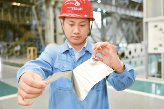 △寬幅精密帶鋼箔材,被形象地稱為“手撕鋼”。