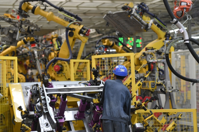 △2020年9月15日,在上汽集團(tuán)乘用車寧德基地車身車間,工人操作機(jī)器人分拼汽車板材。