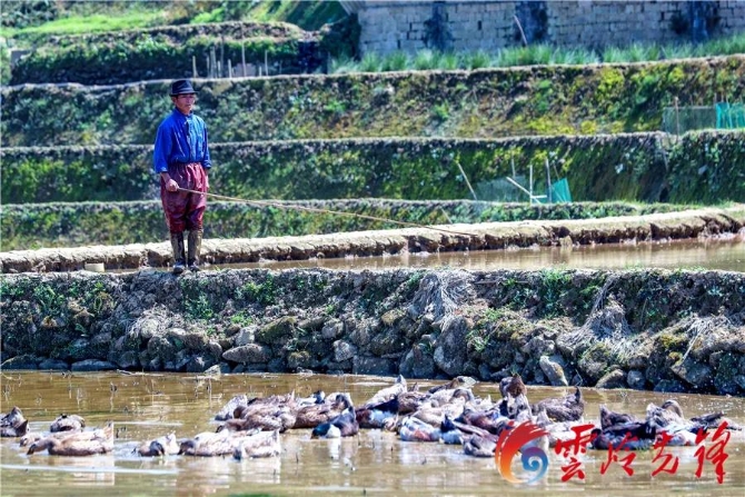 村民張正明就是新街鎮(zhèn)大魚塘村的一名趕溝人,梯田的蓄水期、秧苗的生長期是張正明比較忙碌的時(shí)候。他主要負(fù)責(zé)溝渠的日常管護(hù),常常需要帶著鋤頭和鐮刀去疏通溝渠,保證溝水能不間斷流進(jìn)各家的梯田里。張正明這樣的趕溝人也成為了維持“四素同構(gòu)”生態(tài)系統(tǒng)的重要一環(huán)。