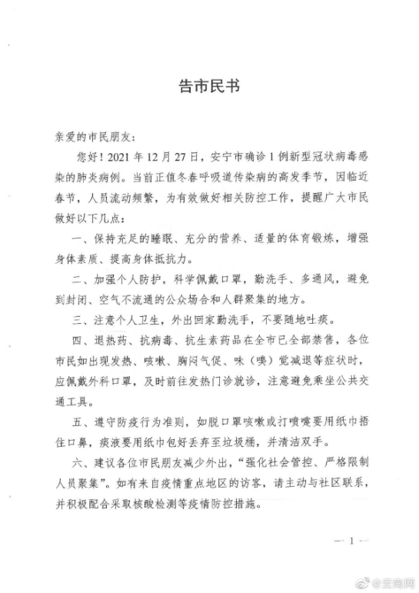 12月28日,安寧市應(yīng)對(duì)新型冠狀病毒感染肺炎疫情防控工作指揮部辦公室發(fā)布告市民書。詳情如下