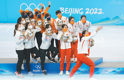 2月13日,獲獎(jiǎng)選手手持北京冬奧會(huì)吉祥物“冰墩墩”自拍。人民日?qǐng)?bào) 記者 李 舸攝