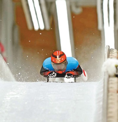 2月11日,國家雪車雪橇中心,中國選手殷正佩戴的“游龍虎冠”頭盔頗具“中國風(fēng)”。人民日?qǐng)?bào)記者 伊 霄攝