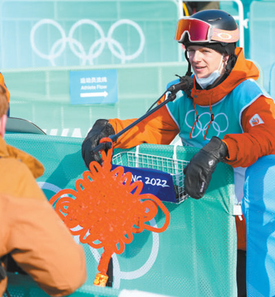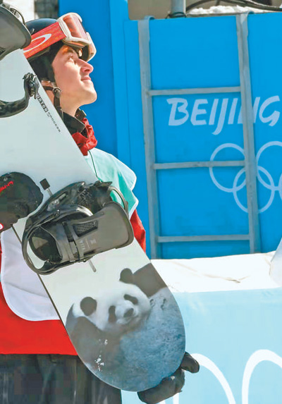2月15日,在單板滑雪男子大跳臺(tái)決賽后,加拿大選手馬克·麥克莫里斯展示其雪板上印制的大熊貓圖案。人民日?qǐng)?bào)記者 李 舸攝