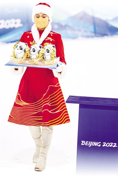 2月5日,在自由式滑雪男子雪上技巧比賽頒獎(jiǎng)儀式上,禮儀人員身著以中國傳統(tǒng)吉祥符號(hào)為主題的“瑞雪祥云”頒獎(jiǎng)禮服。新華社記者 吳 壯攝