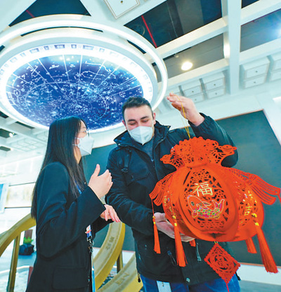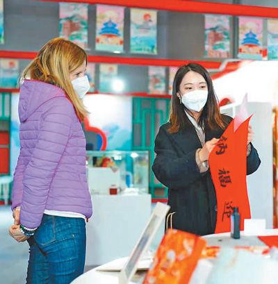 2月15日,工作人員(右)在北京冬奧會(huì)主媒體中心“北京故事”展區(qū)向外籍人士介紹中國傳統(tǒng)年俗。人民日?qǐng)?bào)記者 賀 勇攝