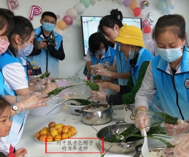 秦坤芬教孩子們包粽子。