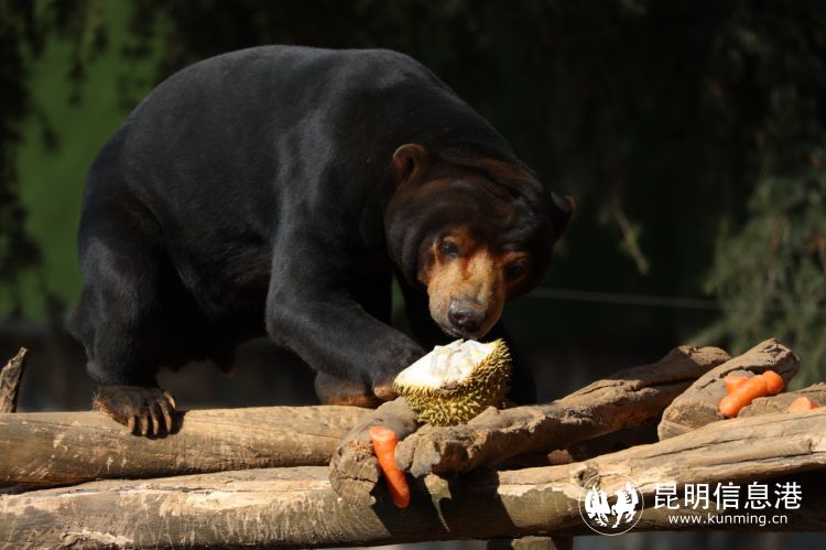 生活在東南亞和南亞一帶的馬來熊,是體型最小的熊科動(dòng)物,生活在熱帶雨林中的它們喜食水果,所以園方選用了最具代表性的熱帶水果榴蓮當(dāng)作馬來熊們的“特制元宵”。作為攀爬高手,它們輕松擊落掛在爬架上的榴蓮,用爪子掰開,大口大口吃了起來。