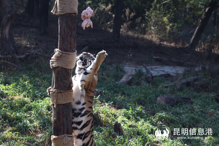 此外,鳥中大力士——鸚鵡,園區(qū)為他們準(zhǔn)備了“核桃元宵”,它們強(qiáng)有力的喙,能啄開堅(jiān)硬的果實(shí)外皮。東北虎收到的則是由雞胸肉組成的大肉球元宵。為了增強(qiáng)他們運(yùn)動(dòng)量,保育員把“肉球元宵”吊在了樹上,增加采食過程中的運(yùn)動(dòng)量,讓它們在享用美食的同時(shí)也能保持健康的體魄。