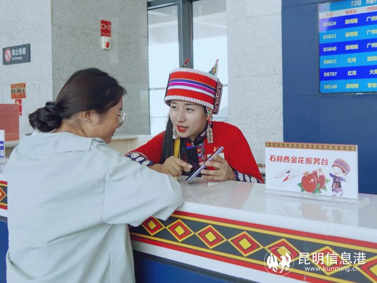 石林西站金花服務(wù)臺,“金花”正在為旅客解答問題。石佳 攝