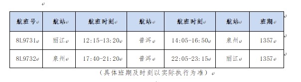 據(jù)介紹,祥鵬航空麗江=普洱=泉州航線目前是三地間獨(dú)飛航線,每周一、三、五、七執(zhí)飛。去程航班號(hào)為8L9731,12:15從麗江起飛,13:20抵達(dá)普洱,14:05從普洱起飛,16:50抵達(dá)泉州;回程航班號(hào)為8L9732,17:40從泉州起飛,21:20抵達(dá)普洱,22:05從普洱起飛,23:15抵達(dá)麗江。