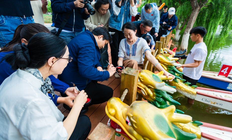 在由舞龍、舞獅、彩帶龍組成的開場表演后,云南民族大學(xué)黨委副書記赫詩錦宣布活動開幕,跟隨嘉賓一起為龍舟“點睛”。據(jù)悉,此次比賽分為專業(yè)組和非專業(yè)組以計時淘汰方式進行,由師生組成的38支參賽隊伍按小組依次上船比賽。隨著發(fā)令槍響起,選手們隨鼓點奮力劃槳,龍舟在雨花湖上踏浪前行,場面熱烈,吸引了大批師生現(xiàn)場觀看、吶喊助威、留影拍照。