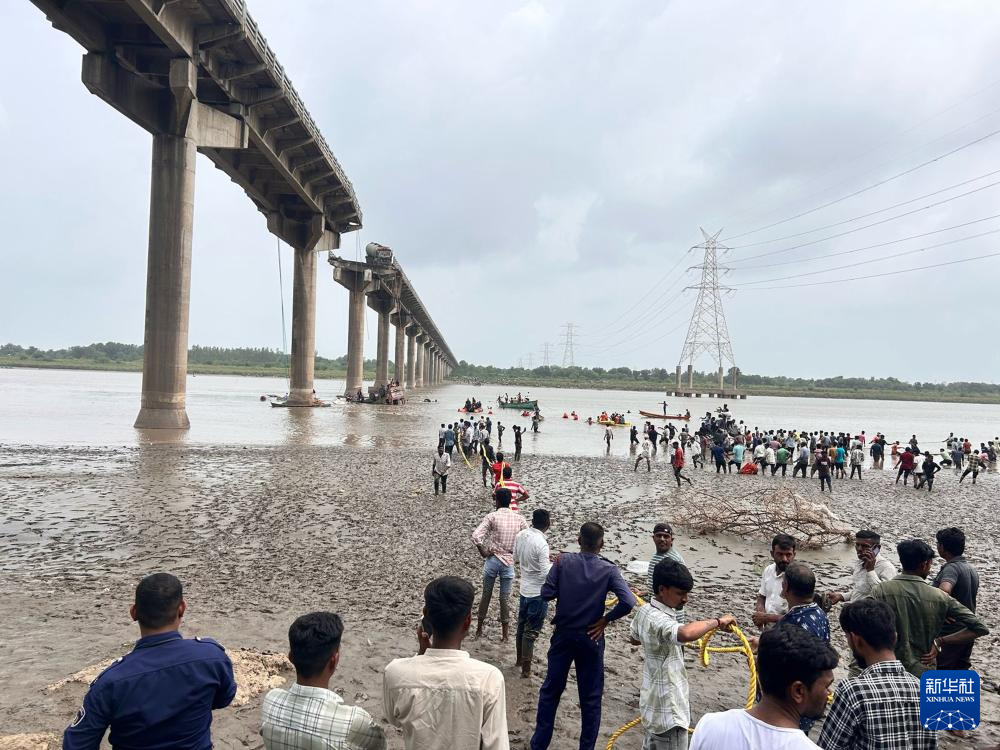 7月9日,救援人員在印度西部古吉拉特邦垮塌的橋梁旁開展救援行動。新華社/印度聯(lián)合新聞社