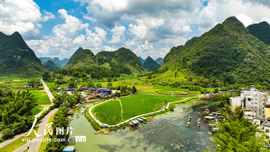 在廣西壯族自治區(qū)靖西市新靖鎮(zhèn)鵝泉村,游客乘坐竹排泛舟湖上,欣賞山水美景 圖源:人民圖片